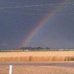 Rainbow over cut wheat field